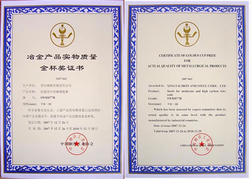 Medium and high carbon Wire SWRH77B for drawing awarded the Gold Cup Prize of Metallurgy products.