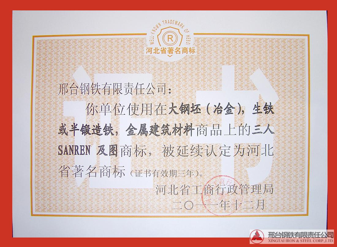 The Three Person brand was reawarded the Famous trademarks of Hebei with three years validity period.