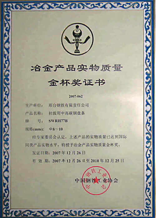 拉撥用中高碳鋼盤(pán)條SWRH77B獲冶金產(chǎn)品實(shí)物質(zhì)量金杯獎(jiǎng)