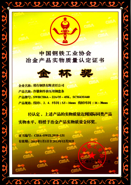 冷鐓和冷擠壓用鋼盤條SWRCH6A~22A/35~45K,SCM435/440獲冶金產(chǎn)品實(shí)物質(zhì)量金杯獎(jiǎng)