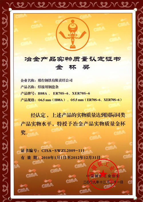 焊接用鋼盤條H08A、ER70S-6、XER40S-6獲冶金產(chǎn)品實(shí)物質(zhì)量金杯獎(jiǎng)