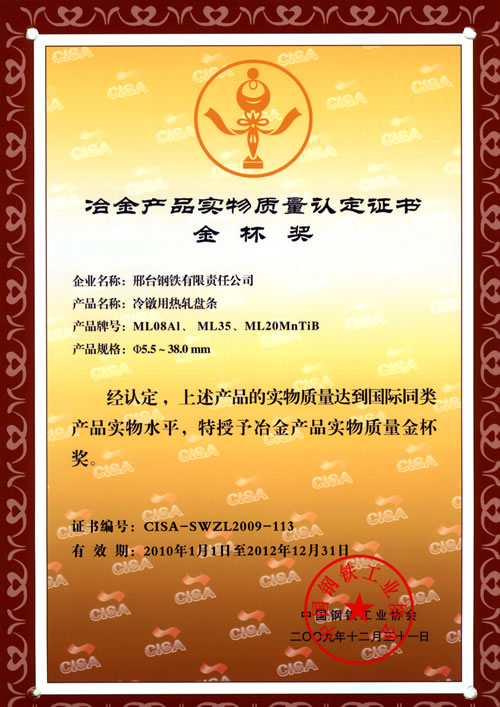冷鐓用熱軋盤條ML08AL、ML35、ML20MnTiB獲冶金產(chǎn)品實(shí)物質(zhì)量金杯獎(jiǎng)