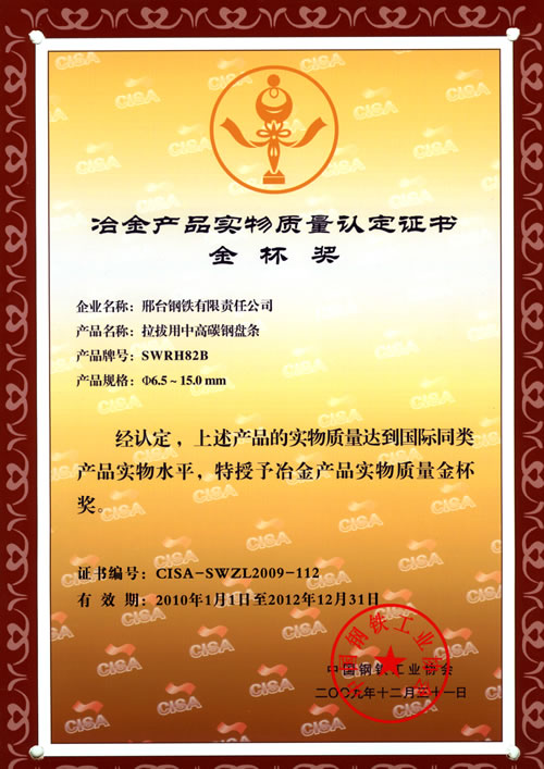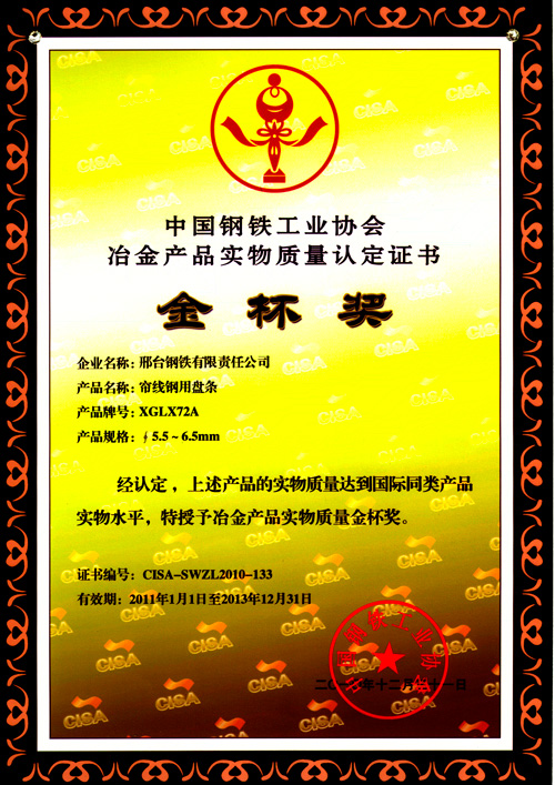 簾線鋼用盤條XGLX72A獲冶金產(chǎn)品實(shí)物質(zhì)量金杯獎(jiǎng)