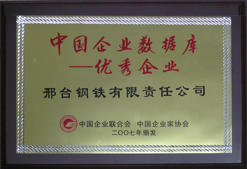 2007年12月,邢鋼榮獲由中國(guó)企業(yè)聯(lián)合會(huì)、中國(guó)企業(yè)家協(xié)會(huì)頒發(fā)的“中國(guó)企業(yè)數(shù)據(jù)庫(kù)優(yōu)秀企業(yè)”榮譽(yù)稱號(hào)。