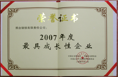 - 邢鋼榮獲“2007年度最具成長(zhǎng)性企業(yè)”榮譽(yù)稱號(hào)