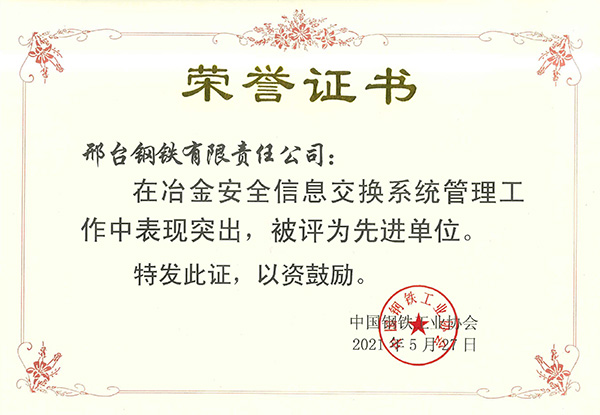 2022年1月,邢鋼被河北省應(yīng)急管理與安全生產(chǎn)協(xié)會(huì)評(píng)為“2021年度應(yīng)急管理與安全生產(chǎn)先進(jìn)單位”。
