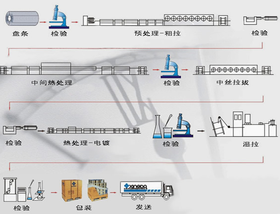 Ф5.5mm 盤條→預處理→粗拉→中絲熱處理(奧氏體化→索氏體化)→表面處理→中拉→成品前熱處理(奧氏體化→索氏體化)→表面處理→電鍍→熱擴散→濕拉→檢驗→包裝入庫。