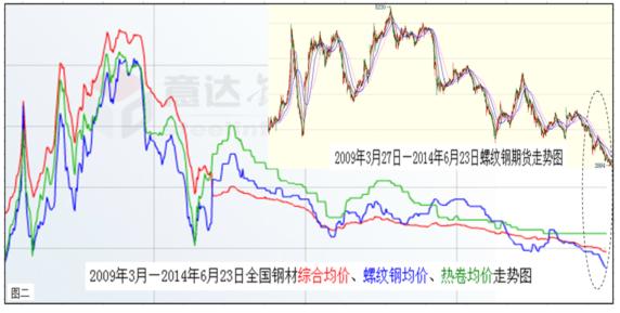 底線的提高,勢必助推中國經(jīng)濟大勢呈現(xiàn)前低后高的走勢。而經(jīng)過長期低迷的中國鋼材市場,也已經(jīng)具備逐漸走強的兩大要素:一是鋼市走強的外在環(huán)境趨好(見上圖一)。包括上半年推出一系列微刺激效應(yīng)逐漸顯現(xiàn),下半年由于經(jīng)濟增長底線提高,以及持續(xù)加推的動力措施等合成發(fā)酵,定會形成遠比上半年良好的鋼市發(fā)展環(huán)境;二是鋼市走強的內(nèi)在動能充沛(下圖二)。鋼材價格經(jīng)過長期下跌后,已經(jīng)下穿了所有的技術(shù)阻力位,使業(yè)內(nèi)根本無法從技術(shù)面進行詮釋。但從價值規(guī)律、市場規(guī)律以及基本面情況看,目前鋼材價格的底部特征已經(jīng)十分明顯,空方量能也已近衰竭。因此,經(jīng)過短時間的整固蓄勢后,震蕩上揚應(yīng)該是后期運行的主基調(diào)。如果再結(jié)合宏觀上經(jīng)濟增長底線的提高,下半年鋼材價格恢復性上揚既在情理之中,也是勢所必然。所以,基于經(jīng)濟和鋼市大勢筆者作出,下半年全國鋼材價格勢必高于上半年的預測。