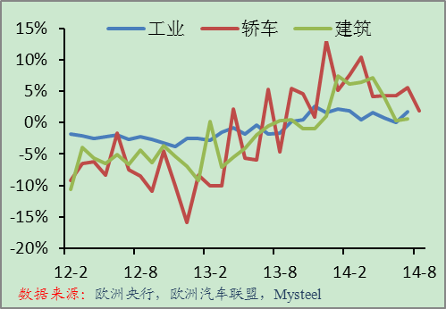 歐元區(qū)9月制造業(yè)PMI初值為50.5%,連續(xù)5個月環(huán)比下降,表明歐元區(qū)經(jīng)濟增長依舊低迷,加之當前歐元區(qū)低通脹未見起色,預計經(jīng)濟低增長可能在一段時間內(nèi)為歐元區(qū)經(jīng)濟的常態(tài)。目前歐洲央行采取逐步放寬政策的措施來改善歐元區(qū)信貸,但從當前來看,并沒有多大改善,預計歐洲央行將進一步放寬政策以挽救歐元區(qū)經(jīng)濟。但即便如此,在財政改革遲緩的情況下,貨幣政策對于經(jīng)濟的刺激效果不大。從歐洲下游行業(yè)的表現(xiàn)看,增長速度也是連續(xù)下滑。