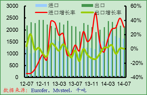 8月份歐洲粗鋼日均產(chǎn)量為48.9萬噸,環(huán)比下降7%,同比增長2.8%,需求季節(jié)性下降所致。9月份歐洲需求季節(jié)性復蘇,預計粗鋼日均產(chǎn)量將環(huán)比回升。7月份歐盟出口鋼材215萬噸,同比增長0.2%,進口鋼材163萬噸,同比增長31%,凈出口量52萬噸,同比下降42%,環(huán)比持平。9月份歐元兌美元大幅貶值,歐洲鋼廠的進口壓力明顯緩解,而出口競爭力得到加強,預計四季度歐洲鋼材凈出口量將環(huán)比大幅回升。