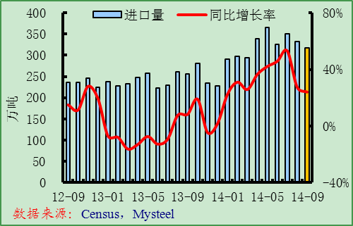 8月份美國鋼材進口量為333萬噸,同比增長27.4%,但環(huán)比下降5%。分品種看,與去年8月份相比,主要品種進口量均實現(xiàn)增長,依然是冷軋、鍍鋅板與中厚板的進口量增長最明顯,其中中厚板增長114%,冷軋增長65.7%,鍍鋅板增長46.1%。與今年7月份比,除半成品、長材、線材和螺紋鋼進口量環(huán)比增長外,其他品種均環(huán)比下降,其中螺紋鋼增長最快,為191.5%。最新的統(tǒng)計數(shù)據(jù)顯示,截至到2014年9月24日,9月份美國鋼材進口許可證數(shù)為317萬噸,高于去年9月水平,與8月份同期數(shù)據(jù)基本持平,預計今年9月份美國鋼材進口量同比仍將大幅增加,環(huán)比基本持平或略有增長。