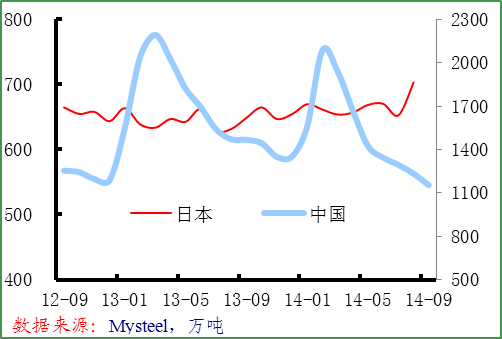 9月份中國流通環(huán)節(jié)鋼材庫存繼續(xù)下降,9月底全國主要鋼的社會庫存為1154萬噸,比8月底下降80萬噸,較去年同期下降314萬噸,鋼廠價格大幅下滑,貿(mào)易商加大了去庫存力度。中鋼協(xié)統(tǒng)計數(shù)據(jù)顯示,9月中旬末重點鋼企鋼材庫存為1590萬噸,較8月中旬末增長65萬噸,全國重點鋼廠鋼廠庫存連續(xù)兩個月增長。日本國內(nèi)庫存大幅上升,8月末全國鋼材庫存為703萬噸,創(chuàng)10年來最高水平,鋼廠庫存增長明顯,市場需求難以消化供應。