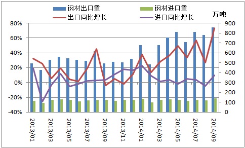 2014年9月我國(guó)出口鋼材852萬噸,創(chuàng)下歷史新高,同比大增73.2%。一方面,上年同期基數(shù)較低,導(dǎo)致9月鋼材出口同比增速上升明顯。另一方面,9月我國(guó)鋼材出口均價(jià)加速下跌,國(guó)際競(jìng)爭(zhēng)優(yōu)勢(shì)明顯,進(jìn)一步刺激鋼材出口。當(dāng)月鋼材出口均價(jià)739美元/噸,環(huán)比下降4.9%,同比下降10.7%。