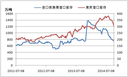 圖二:焦炭、焦煤港口庫存走勢(shì)