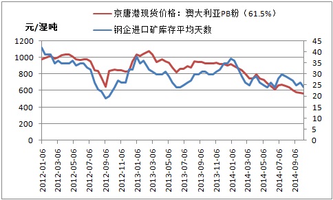 圖三:鋼企進(jìn)口礦庫存天數(shù)與京唐港澳粉價(jià)格走勢(shì)