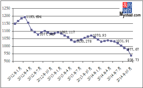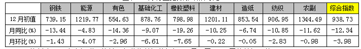 2014年12月份,上海鋼聯(lián)大宗商品價格指數(shù)(MyBCIC)初值為938.73,同比下跌了12.34%;環(huán)比下跌了3.98%,同環(huán)比跌幅繼上月均有所擴(kuò)大。
