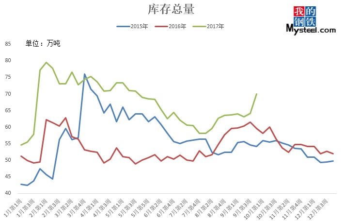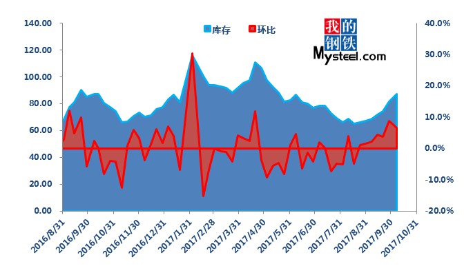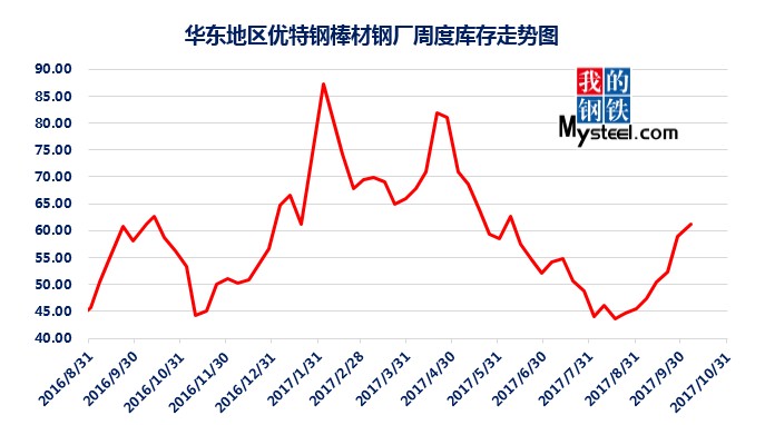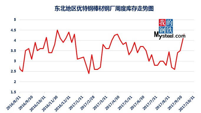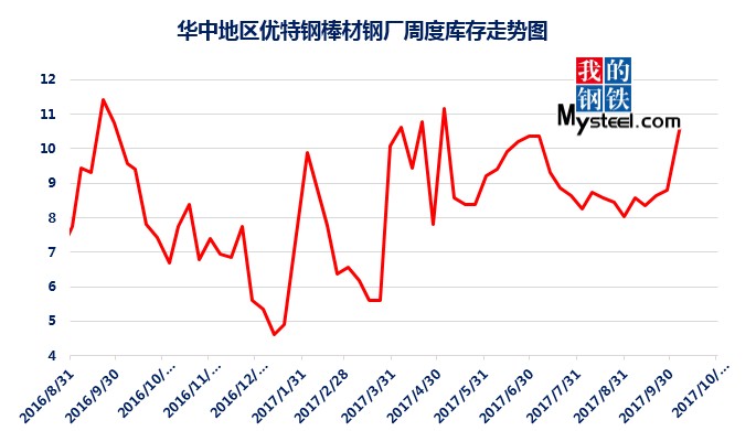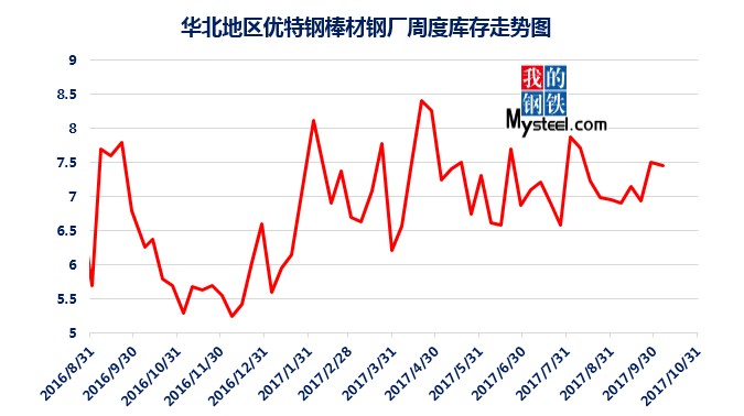 據(jù)mysteel統(tǒng)計的樣本優(yōu)特鋼廠庫存顯示,現(xiàn)全國優(yōu)特鋼廠棒材總庫存86.92萬噸,較國慶節(jié)前增加5.67萬噸,環(huán)比增加6.5%,較2016年國慶節(jié)后第一周庫存低0.31萬噸,較2016年均值高9.61萬噸,上漲12.43%。2017年內(nèi)均值為84.43萬噸,當(dāng)前庫存較均值增加2.49萬噸。樣本鋼廠總庫存連續(xù)7周上漲。