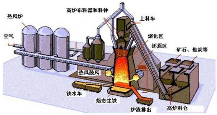 高爐生產(chǎn)過程就是將鐵礦石在高溫下冶煉成生鐵的過程。從爐頂裝入鐵礦石、焦炭、造渣用熔劑(石灰石),從位于爐子下部沿爐周的風(fēng)口吹入預(yù)熱的空氣。在高溫下,焦炭中的碳(有的高爐也噴吹煤粉、重油、天然氣等輔助燃料)同鼓入空氣中的氧發(fā)生燃燒反應(yīng),產(chǎn)生高溫和還原性氣體,這些還原性氣體在上升過程中加熱緩慢下行的爐料,并將鐵礦石中的鐵氧化物還原成金屬鐵。