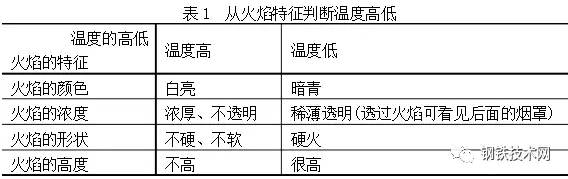由上二表可見不能只憑一種“視覺信號”就判斷出爐內的情況,而是根據(jù)多種信號綜合判斷爐內情況,例如要從火焰的顏色、濃度、形狀、高度等來綜合判斷爐內溫度情況。在判斷終點含碳量時,既要看火花特征,還可考慮火焰形狀的變化。在收高碳時要看火焰擺動的幅度,由大至小,在收低碳時要看火焰下降情況。