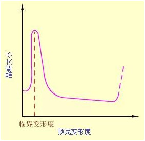(2)預(yù)先變形度 變形度的影響主要與金屬變形的均勻度有關(guān)。變形越不均勻, 再結(jié)晶退火后的晶粒越大。變形度很小時,因不足以引起再結(jié)晶,晶粒不變。當(dāng)變形度達(dá)到2~10%時,金屬中少數(shù)晶粒變形,變形分布很不均勻,所以再結(jié)晶時生成的晶核少,晶粒大小相差極大,非常有利于晶粒發(fā)生吞并過程而很快長大,結(jié)果得到極粗大的晶粒。使晶粒發(fā)生異常長大的變形度稱作臨界變形度。生產(chǎn)上應(yīng)盡量避免在臨界變形度范圍內(nèi)的塑性變形加工。超過臨界變形度之后,隨變形度的增大,晶粒的變形更加強(qiáng)烈和均勻,再結(jié)晶核心越來越多,因此再結(jié)晶后的晶粒越來越細(xì)小。但是當(dāng)變形度過大(約≥90%)時, 晶粒可能再次出現(xiàn)異常長大,一般認(rèn)為它是由形變織構(gòu)造成的。