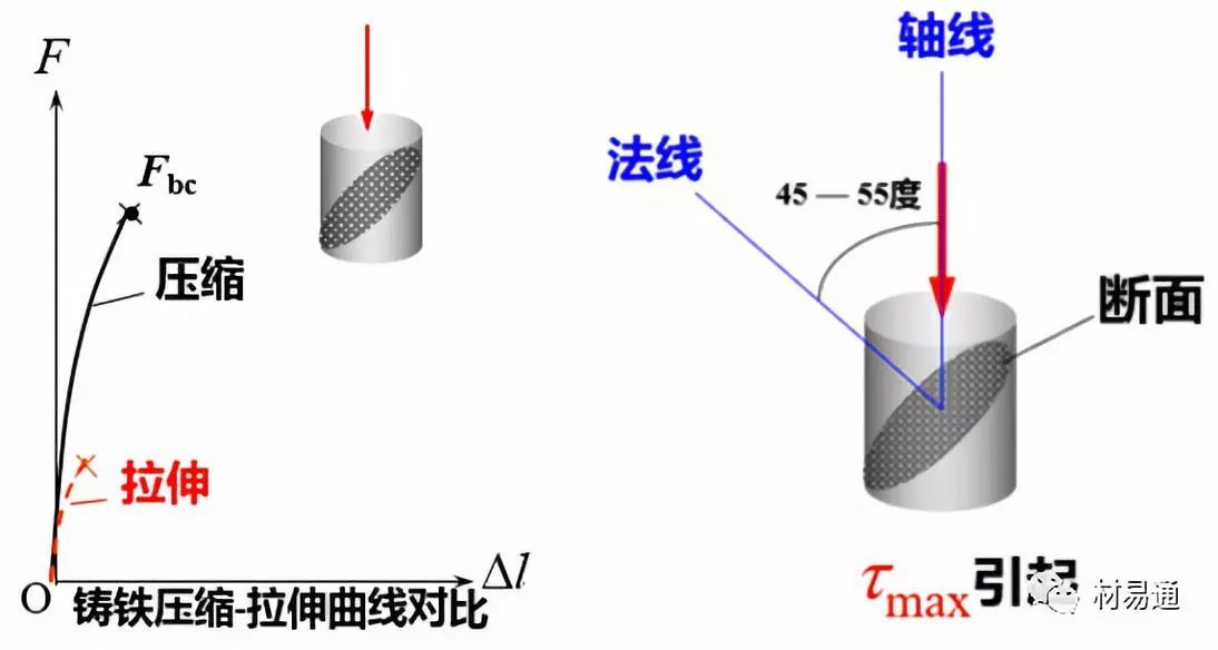 表明斷裂是由最大拉應(yīng)力引起的。而最大拉應(yīng)力先于最大剪應(yīng)力達到強度極限后發(fā)生斷裂又說明了鑄鐵的抗拉能力弱于其抗剪能力。