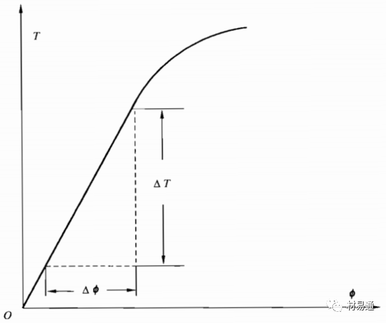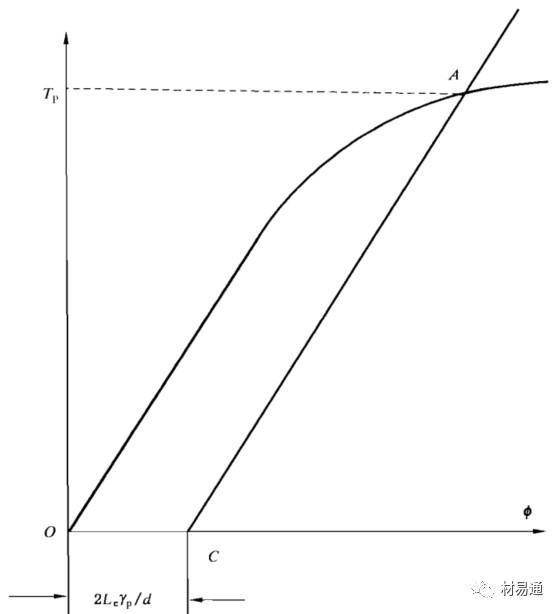 用自動記錄方法記錄扭矩—扭角曲線。在曲線上延長彈性直線段交扭角軸于O點,截取OC段,過C點作彈性直線段的平行線CA交曲線于A點,A點對應(yīng)的扭矩為Tp。
