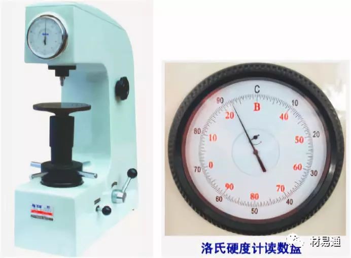原理:用金剛石圓錐或淬火鋼球壓頭,在試驗壓力F的作用下,將壓頭壓入材料表面,保持規(guī)定時間后,去除主試驗力,保持初始試驗力,用殘余壓痕深度增量計算硬度值,實際測量時,可通過試驗機的表盤直接讀出洛氏硬度的數(shù)值。