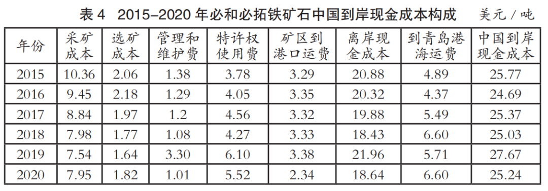 中國進(jìn)口鐵礦石到岸成本主要由離岸現(xiàn)金成本和海運(yùn)成本兩部分構(gòu)成。表1至表4為2015-2020年國際四大礦鐵礦石中國到岸現(xiàn)金成本構(gòu)成情況(數(shù)據(jù)來源:AME),其中離岸現(xiàn)金成本由采礦成本、選礦成本、管理和維護(hù)費(fèi)、特許權(quán)使用費(fèi)和礦區(qū)到港口運(yùn)費(fèi)構(gòu)成;中國到岸現(xiàn)金成本由離岸現(xiàn)金成本和到青島港海運(yùn)費(fèi)構(gòu)成;該成本數(shù)據(jù)僅為現(xiàn)金成本,不含國際四大礦的融資、折舊費(fèi)用。