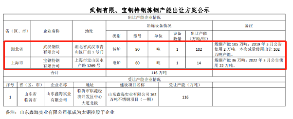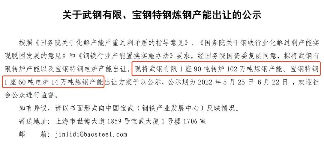 按照《國務(wù)院關(guān)于化解產(chǎn)能嚴(yán)重過剩矛盾的指導(dǎo)意見》、《國務(wù)院關(guān)于鋼鐵行業(yè)化解過剩產(chǎn)能實現(xiàn)脫困發(fā)展的意見》和《鋼鐵行業(yè)產(chǎn)能置換實施辦法》要求,經(jīng)國務(wù)院國資委復(fù)函同意,擬將武鋼有限轉(zhuǎn)爐產(chǎn)能以及寶鋼特鋼電爐產(chǎn)能出讓?,F(xiàn)將武鋼有限1座90噸轉(zhuǎn)爐102萬噸煉鋼產(chǎn)能、寶鋼特鋼1座60噸電爐14萬噸煉鋼產(chǎn)能出讓方案予以公示,公示期為2022年5月25日-6月22日,歡迎社會公眾進行監(jiān)督。