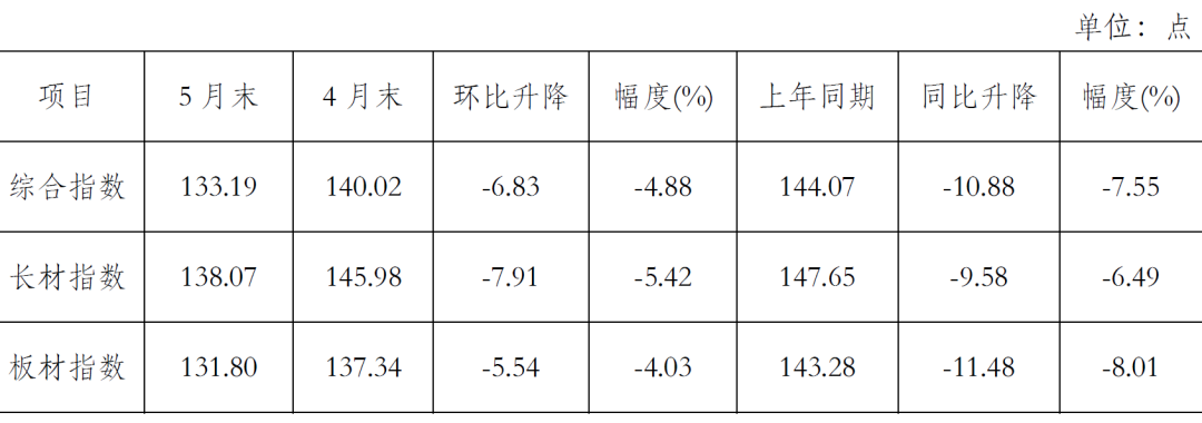 5月末,CSPI長(zhǎng)材指數(shù)為138.07點(diǎn),環(huán)比下降7.91點(diǎn),降幅為5.42%;CSPI板材指數(shù)為131.80點(diǎn),環(huán)比下降5.54點(diǎn),降幅為4.03%。與上年同期相比,長(zhǎng)材、板材指數(shù)分別下降9.58點(diǎn)和11.48點(diǎn),降幅分別為6.49%和8.01%。(見(jiàn)下表)