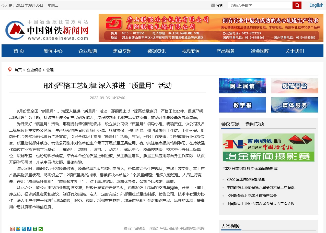 9月份是全國(guó)“質(zhì)量月”。為深入推進(jìn)“質(zhì)量月”活動(dòng),邢鋼提出以“提高質(zhì)量意識(shí),嚴(yán)格工藝紀(jì)律,促進(jìn)邢鋼品牌建設(shè)”為主題,持續(xù)提升該公司產(chǎn)品研發(fā)能力、過(guò)程控制水平和產(chǎn)品實(shí)物質(zhì)量,推動(dòng)開創(chuàng)高質(zhì)量發(fā)展新局面。