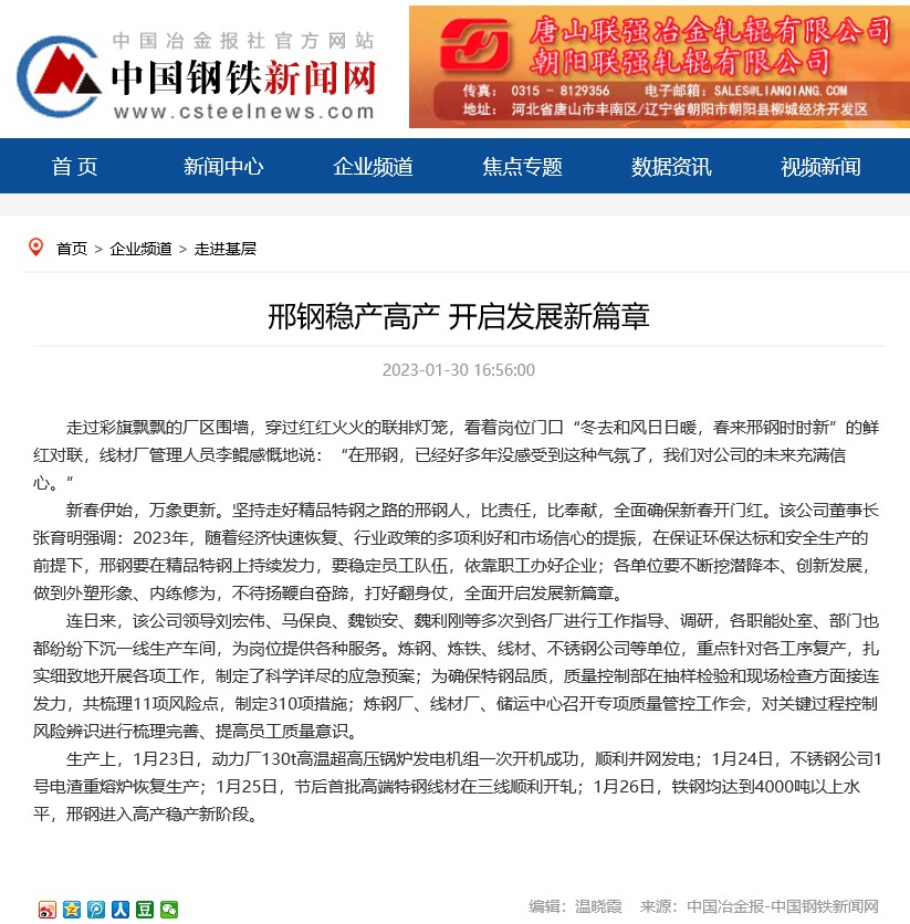 生產(chǎn)上,1月23日,動(dòng)力廠130t高溫超高壓鍋爐發(fā)電機(jī)組一次開(kāi)機(jī)成功,順利并網(wǎng)發(fā)電;1月24日,不銹鋼公司1號(hào)電渣重熔爐恢復(fù)生產(chǎn);1月25日,節(jié)后首批高端特鋼線材在三線順利開(kāi)軋;1月26日,鐵鋼均達(dá)到4000噸以上水平,邢鋼進(jìn)入高產(chǎn)穩(wěn)產(chǎn)新階段。