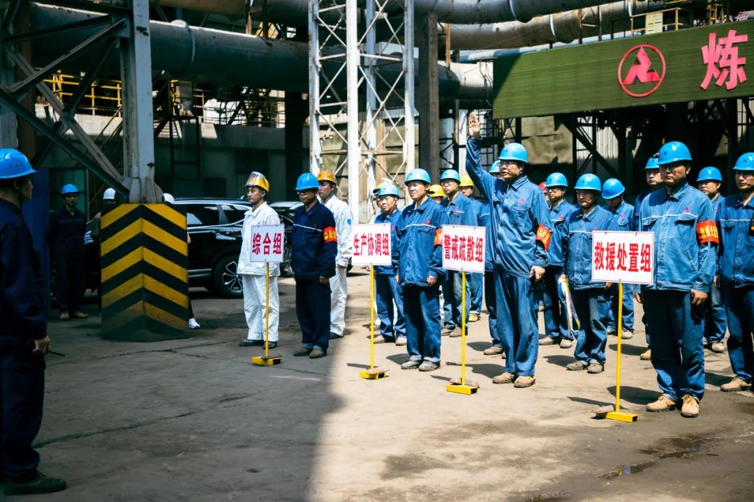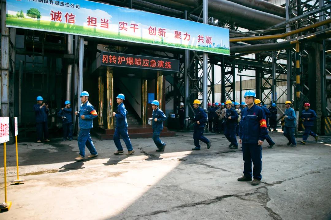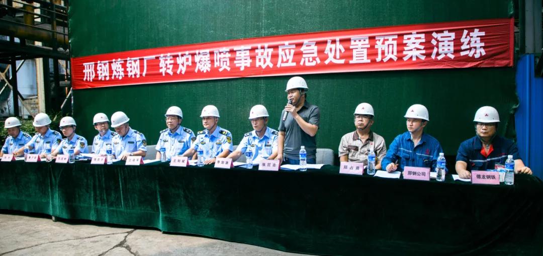 隨后,參會(huì)人員一起現(xiàn)場(chǎng)觀摩了邢鋼高溫熔融金屬爆噴事故現(xiàn)場(chǎng)應(yīng)急處置演練。本次演練,模擬煉鋼廠加料跨天車(chē)向2#轉(zhuǎn)爐加廢鋼時(shí)發(fā)生爆噴為背景,演示了事故上報(bào)、安全疏散、預(yù)案啟動(dòng)、現(xiàn)場(chǎng)搶險(xiǎn)、應(yīng)急救援等環(huán)節(jié)。