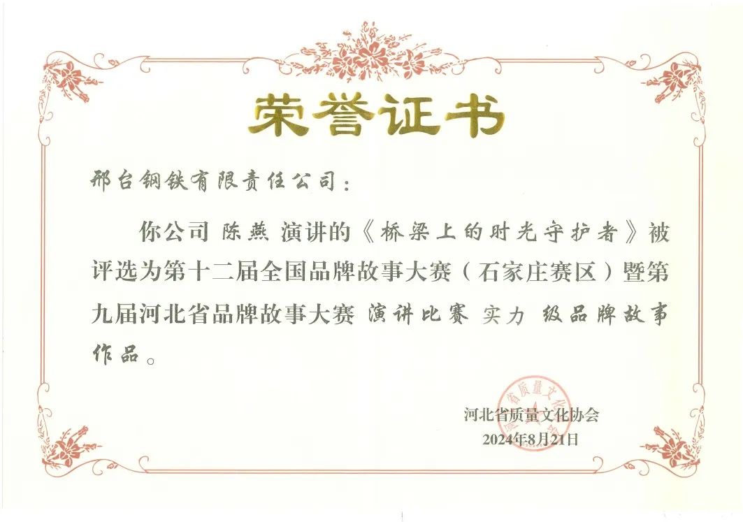 經(jīng)過激烈的角逐,邢鋼參賽的兩部演講作品《橋梁上的時(shí)光守護(hù)者》、《碧水守護(hù),打開泉城綠色畫卷》,憑借其鮮明的主題、完整的情節(jié)、生動(dòng)的語言、深刻的感染力以及自信的表現(xiàn)力脫穎而出,贏得本次大賽“實(shí)力級(jí)”榮譽(yù)。邢鋼申報(bào)的《赤子之心》、《三代邢鋼人共鑄輝煌夢》等征文、短視頻作品也榮獲“優(yōu)秀級(jí)”、“潛力級(jí)”證書。