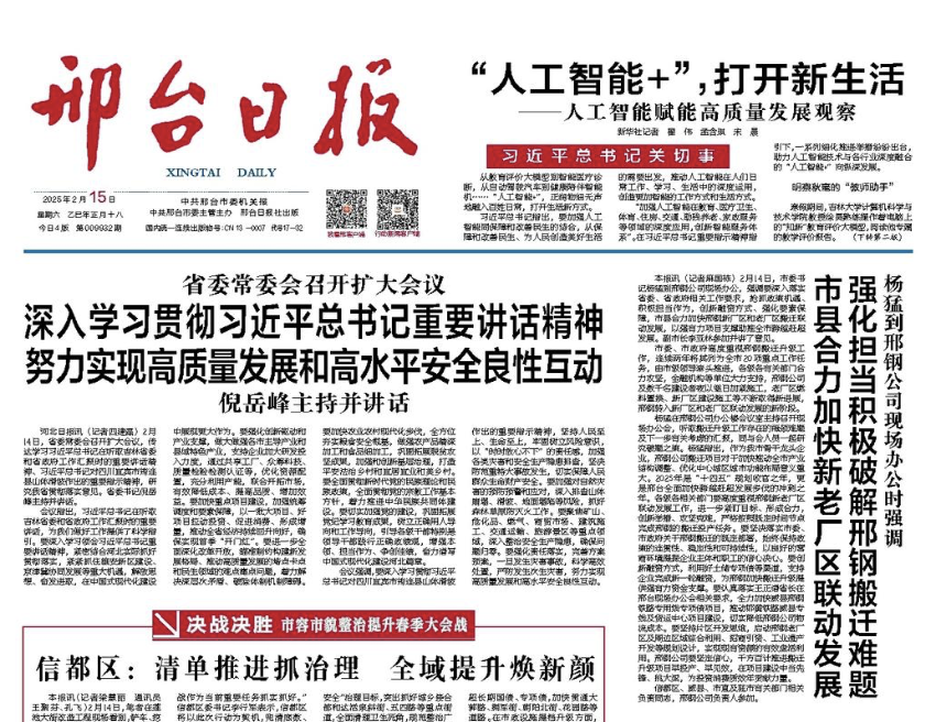2月14日,市委書(shū)記楊猛到邢鋼公司現(xiàn)場(chǎng)辦公,強(qiáng)調(diào)要深入落實(shí)省委、省政府相關(guān)工作要求,搶抓政策機(jī)遇、積極擔(dān)當(dāng)作為,創(chuàng)新融資方式、強(qiáng)化要素保障,市縣合力加快邢鋼新廠區(qū)和老廠區(qū)搬遷聯(lián)動(dòng)發(fā)展,以強(qiáng)有力項(xiàng)目支撐助推全市跨越趕超發(fā)展。副市長(zhǎng)李亞林參加并講了意見(jiàn)。
