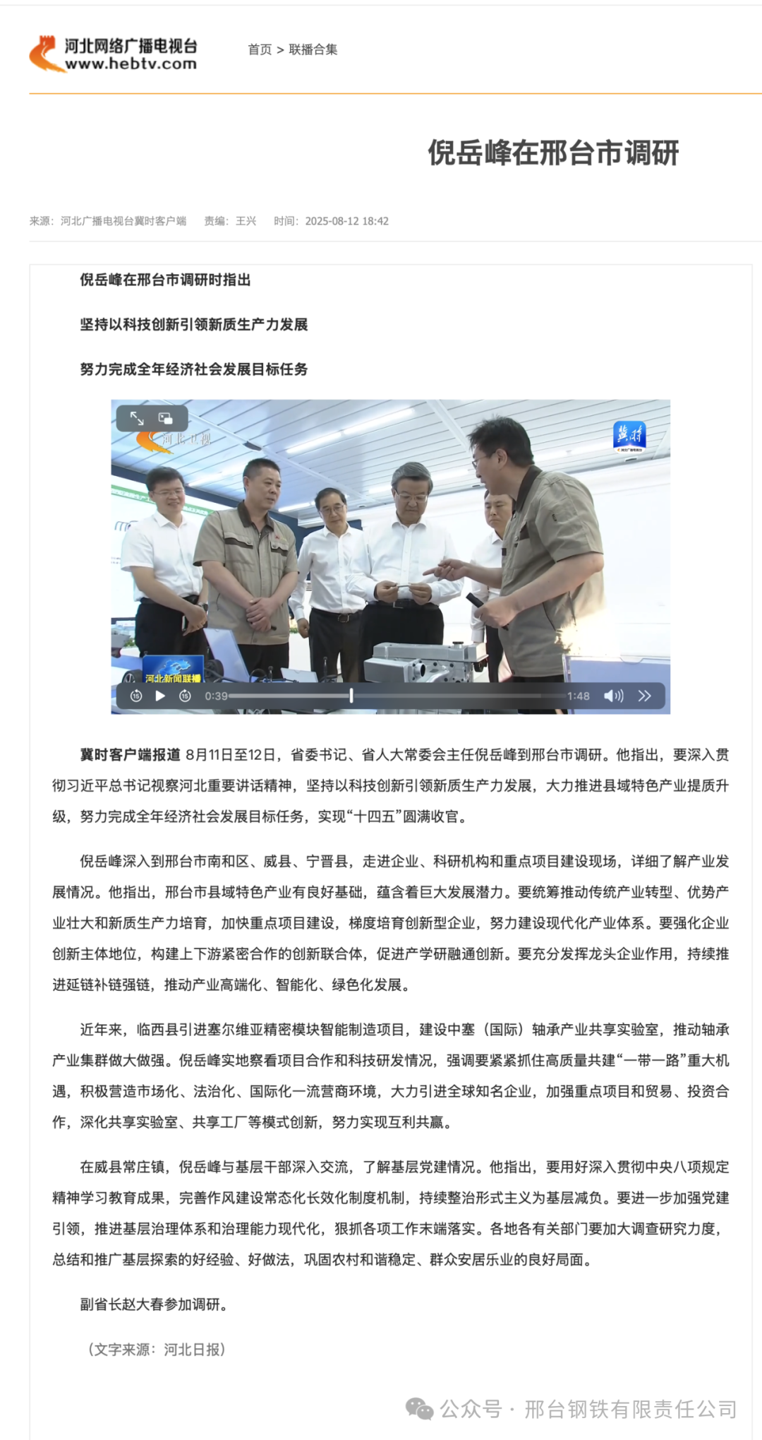 冀時(shí)客戶端報(bào)道 8月11日至12日,省委書記、省人大常委會(huì)主任倪岳峰到邢臺(tái)市調(diào)研。他指出,要深入貫徹習(xí)近平總書記視察河北重要講話精神,堅(jiān)持以科技創(chuàng)新引領(lǐng)新質(zhì)生產(chǎn)力發(fā)展,大力推進(jìn)縣域特色產(chǎn)業(yè)提質(zhì)升級(jí),努力完成全年經(jīng)濟(jì)社會(huì)發(fā)展目標(biāo)任務(wù),實(shí)現(xiàn)“十四五”圓滿收官。